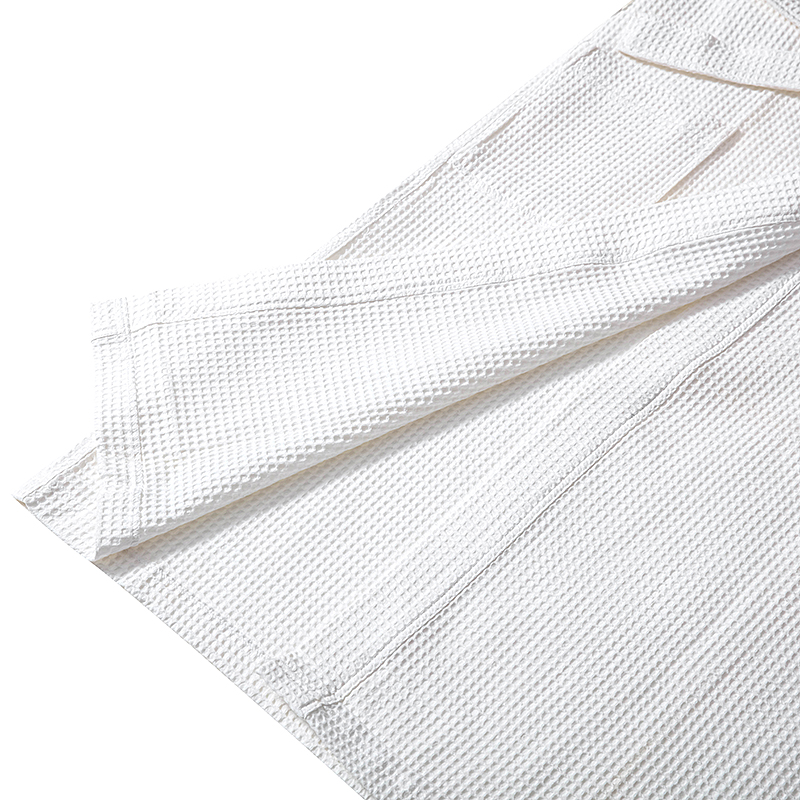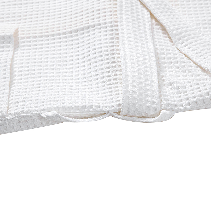 The bathrobe is made from comfortable light weight 100% cotton waffle fabric which is soft and absorbent.