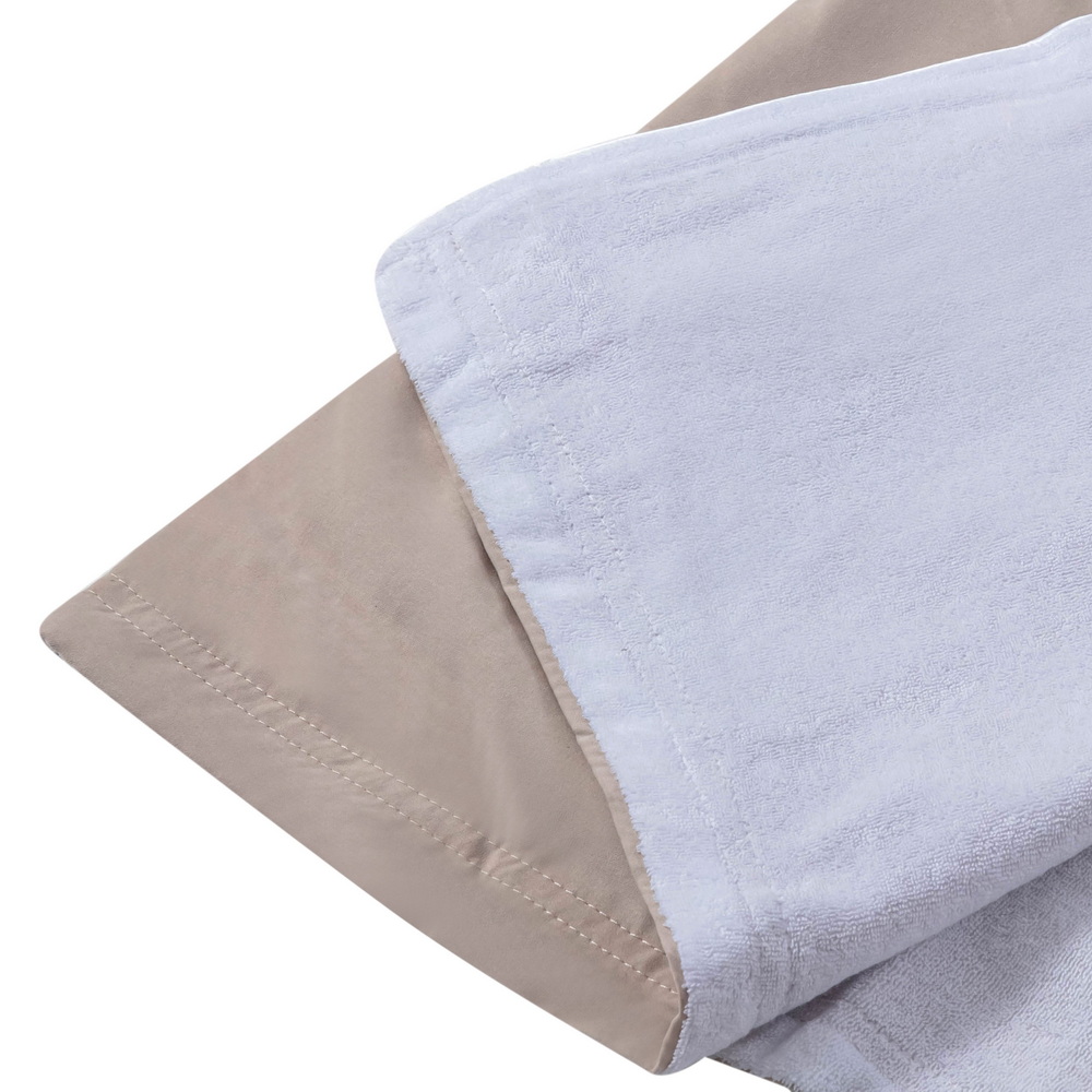 The bathrobe consists 2 layers of fabrics. Outer fabric is super soft 100% microfiber peach skin fabric. The lining fabric is absorbent 80% cotton 20% polyester loop terry. Double Layers provide extra warmth after bath or shower.