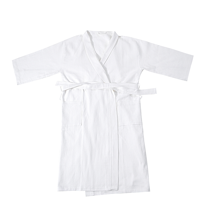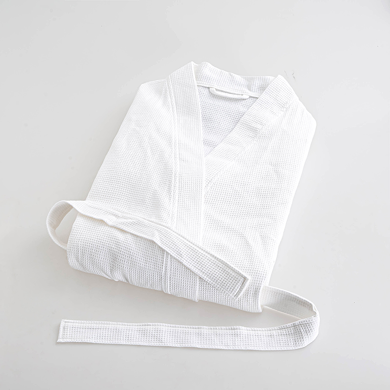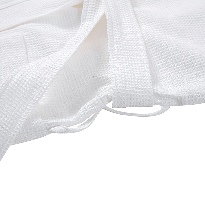 The bathrobe is made from comfortable light weight 100% cotton waffle fabric which is soft and absorbent.